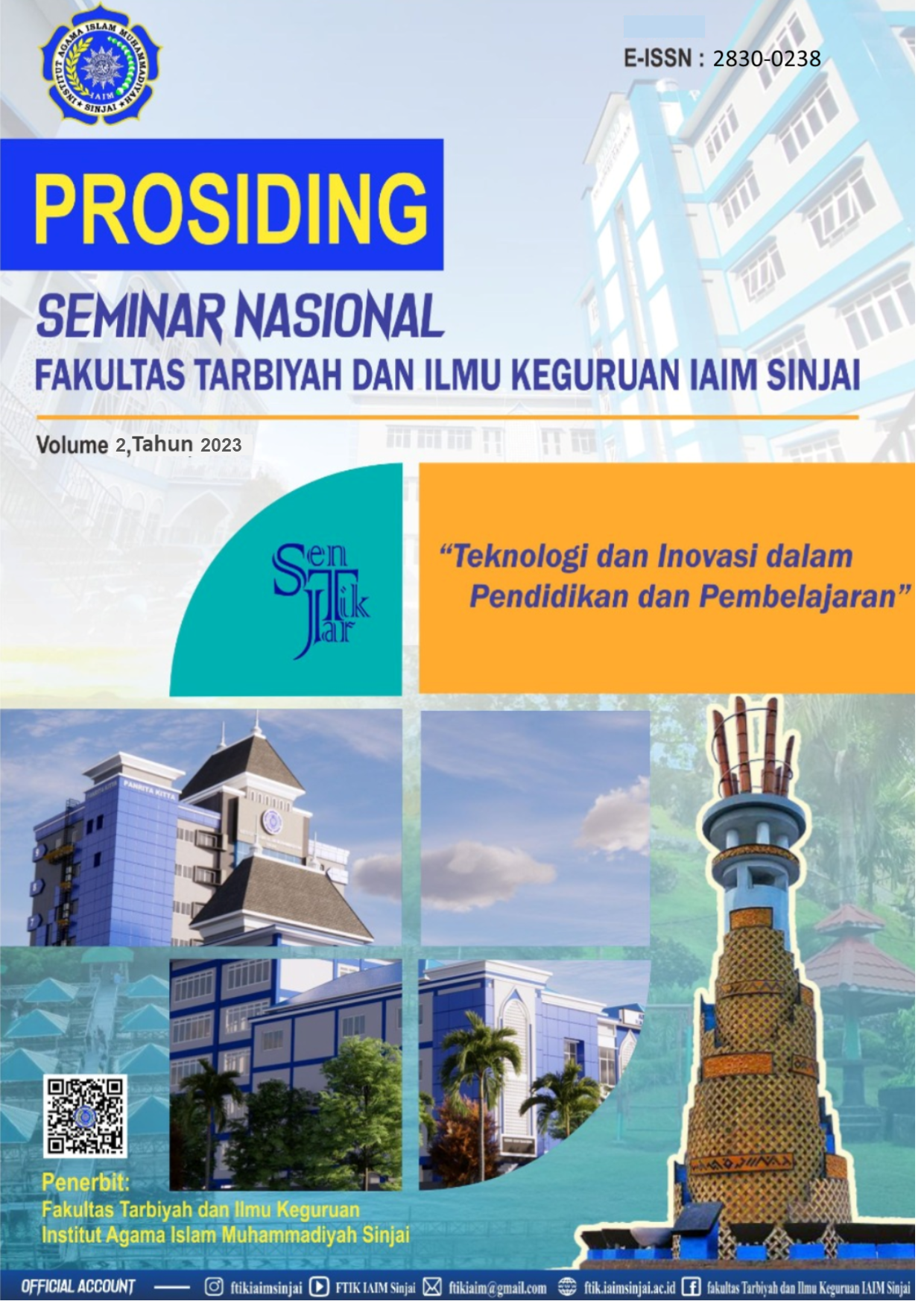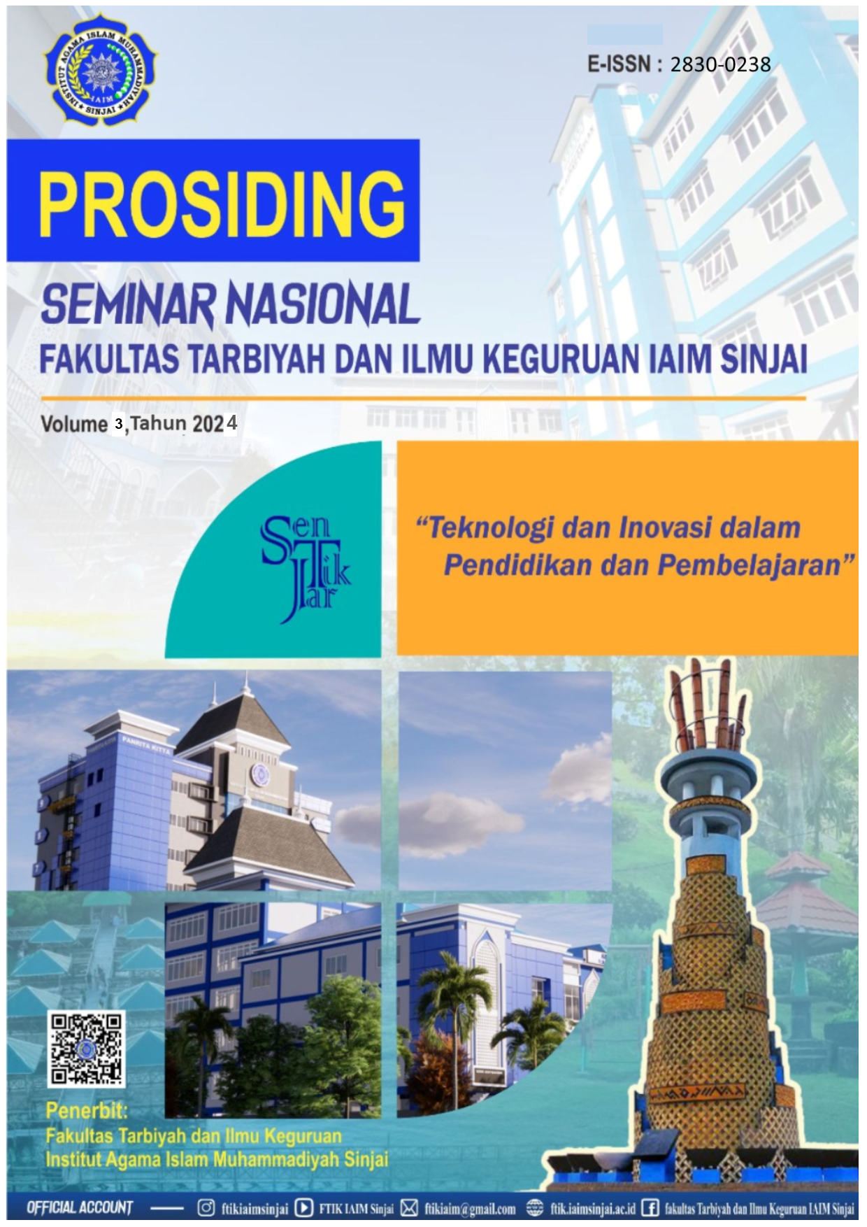 Vol 2 (2023)Prosiding Seminar Nasional Fakultas Tarbiyah dan Keguruan IAIM terbit 1 kali setahun (Mei) sejak 2022, diterbitkan oleh Fakultas Tarbiyah dan Ilmu Keguruan (FTIK) Institut Agama Islam Muhammadiyah (IAIM) Sinjai. Prosiding ini merupakan media publikasi onlina hasil-hasil seminar nasional, khususnya yang di dilaksanakan oleh Fakultas Tarbiyah dan Ilmu Keguruan (FTIK) Institut Agama Islam Muhammadiyah (IAIM) Sinjai. Prosiding ini diharapkan sebagai media bagi dosen, peneliti, praktisi, staf, guru, mahasiswa dan masyarakat luas yang memiliki perhatian terhadap ilmu pendidikan.